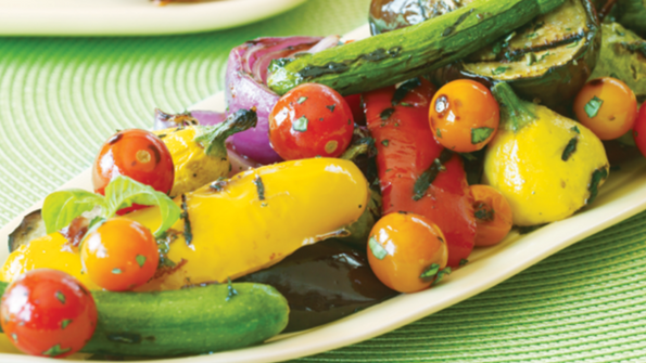 - Preheat grill to medium-high. Remove vegetables from marinade and place on grill; use a grilling basket for smaller pieces. Grill until tender, 5-10 minutes per side. Transfer to a large platter. Garnish with fresh basil.