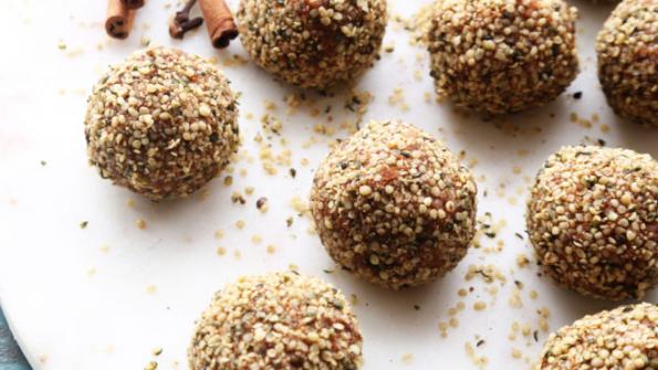 These nutritious energy bites are loaded with super foods, such as Medjool dates, oats, pumpkin and hemp hearts. A great grab-and-go snack! Use Manitoba Harvest Maple & Cinnamon Hemp Heart Toppers.