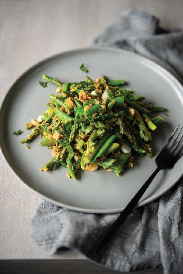 This crunchy salad features two of the stars of spring―snap peas and asparagus―in a mildly spicy peanut dressing. Mint, quinoa, cashews, and fresh mint make this salad tasty and hearty enough for a meal. The robust nature of the salad means it can be made ahead or kept for a day in the fridge in the unlikely case of leftovers.
