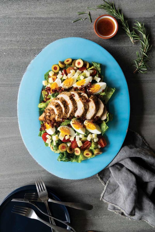 The Cobb salad is a much-adored American classic created in 1937 at the Brown Derby restaurant in Los Angeles, owned by Robert Cobb. Using ingredients from the Spanish culinary canon gives this classic a Spanish twist while staying true to the spirit of the original. Manchego cheese and serrano ham stand in for blue cheese and bacon, eggs get a dusting of smoked paprika, and avocados are replaced with olives, while chicken is given the Spanish treatment with rubbed garlic and rosemary prior to roasting. Our salad is finished with a light and sunny orange-based vinaigrette.