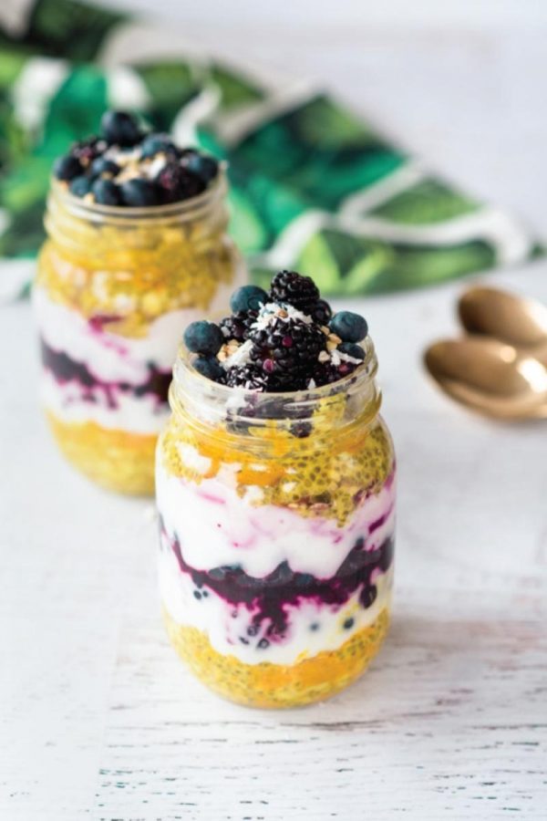 - Once chia pudding has sat overnight, get your favorite glass jars ready for layering. Put a layer of pudding, followed by coconut yogurt and then fruit. Repeat layers again, ending with fruit. Top with a sprinkle of shredded coconut or toasted buckwheat if desired.