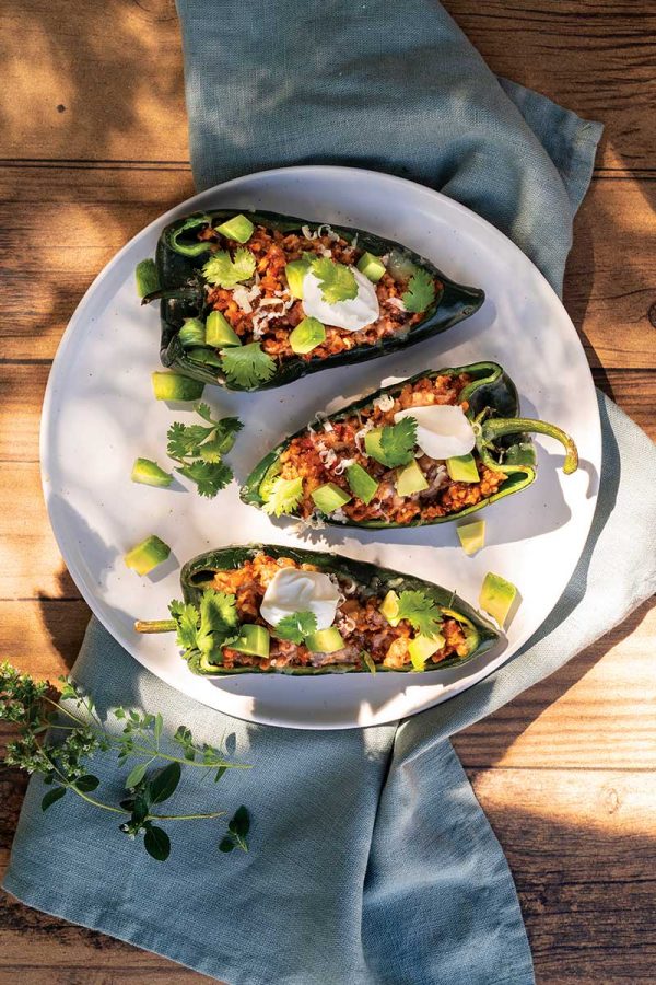 In this enchilada riff, we stuff everything into a roasted poblano pepper shell, rather than tortillas, to pack an extra veggie serving into your meal and trim the starchy calories. If you can’t find poblanos, which are mild, dark green Mexican peppers, you can substitute green bell peppers.