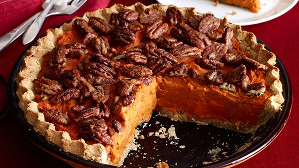 This delicious, citrus-tinged pie features a hearty oat-based crust and tastes decadent even without dairy, eggs, or white sugar. The roasted, glazed pecans add a festive, elegant touch.