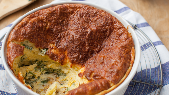 $0.87 per person / Airy cheese soufflé sounds fancy, but it’s actually quite easy and a fun change of pace; plus kids love it! With a serving of spinach included, you have an elegant yet very inexpensive one-dish meal, high in protein and iron. If you want to make a sauce for the soufflé, purée the two leftover egg yolks with a little lemon juice, olive oil, and almost any cooked or roasted vegetables, such as carrots, cauliflower, or sweet potato.