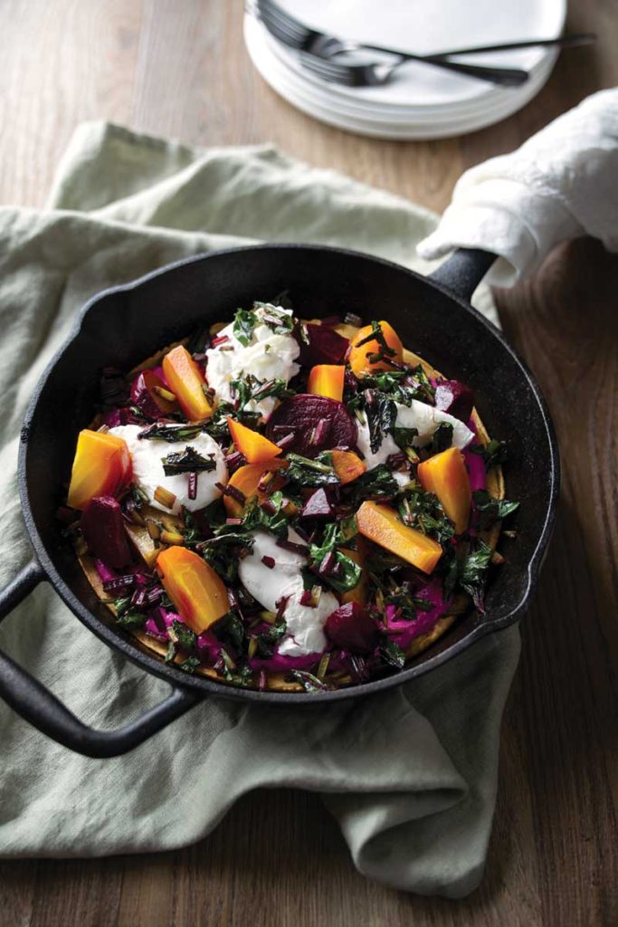 This plant-based brunch showstopper is full of bright earthy flavors. If you can’t find beets with their tops on, feel free to swap in another seasonal green such as chard, collards, or kale.