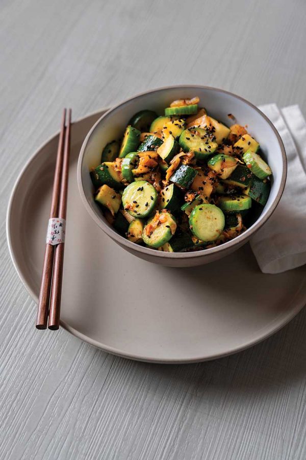 - Once zucchini is cooked, add to cucumber mixture, and gently toss together. Serve warm, at room temperature, or cold with an extra sprinkle of sesame seeds, if desired.
