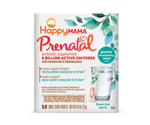 HappyMama Prenatal Probiotic SupplementEach box contains 15 flavor-free, single-serving packs that contain 8 billion CFUs of Lactobacillus rhamnosus HN001 and Bifidobacterium lactis HN019, which have been shown in human studies to reduce the risk of the irksome infant skin condition called eczema, the digestive issues of constipation and diarrhea, as well as overall sick days for mama. |