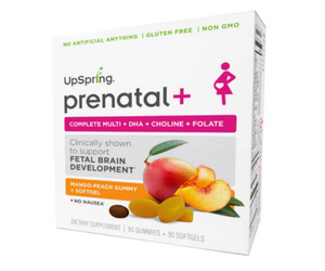 UpSpring Prenatal+This package contains 30 softgels to ensure effective doses of DHA and choline for fetal brain development, along with 90 mango- peach gummies that contain folate to stave off neural tube defects, as well as an all-around multi for all-around health. It’s non-GMO and gluten free, and contains no artificial ingredients. |