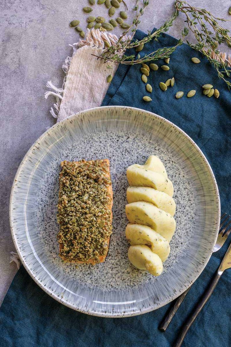 Pumpkin Seed Crusted Salmon with Sweet Potato Mash