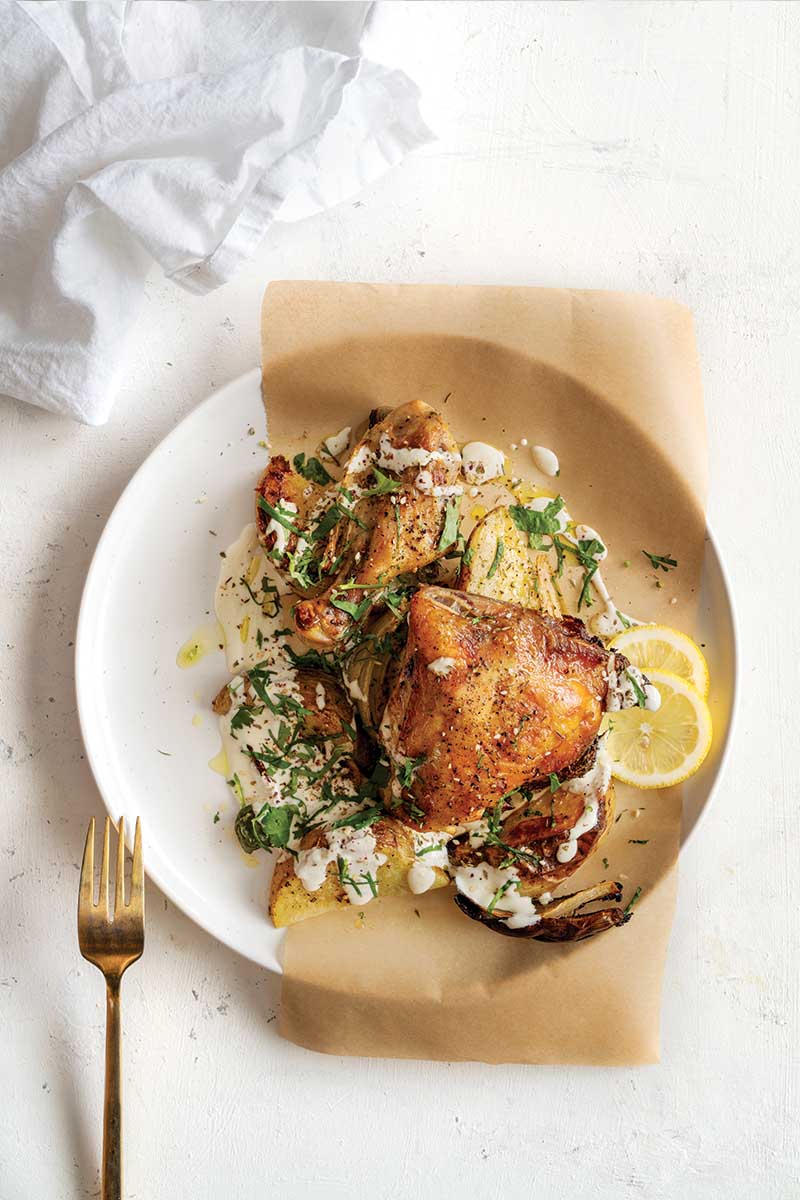 Sheet Pan Chicken with Potatoes, Olives, and Lemony Mustard Yogurt