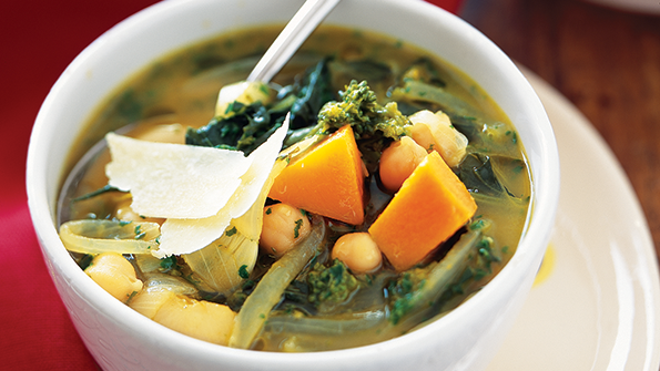 Once flavors have blended, add cannellini or garbanzo beans, butter beans, and haricot verts or string beans. Return to a simmer, then remove from heat. Add arugula paste and stir. Season with salt and pepper. Ladle soup into bowls and serve, garnished with Parmesan cheese and a drizzle of olive oil.