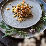 To frying pan with mushrooms, add carrots, celery, and onion; sauté until soft but not browned, about 5 minutes. Add apple cubes and water chestnuts along with herbs and spices, and sauté until apples are soft, about 5 minutes. Add in cooked barley and stir to combine.