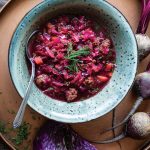 In large saucepan, brown ground bison over medium-high heat. Add in onions, celery, and carrots and cook for 5 to 7 minutes. Add in stock along with the beets and cabbage. Bring to a boil then simmer for 30 minutes.