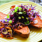 To serve, slice down center of each potato and stuff with lentil mixture. Top with dollops of Greek yogurt and walnuts. Garnish with lemon zest.