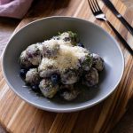 To large bowl, add cooled blueberries, ricotta cheese, 1/2 cup Parmesan cheese, chickpea flour, all-purpose flour, and salt, and gently combine. Cover with clean, damp dishtowel and refrigerate for 1 hour.