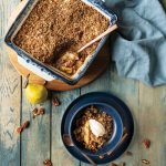 Spread pears into a lightly greased or parchment-lined baking dish and sprinkle oat mixture overtop.