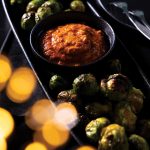 In large bowl, combine Brussels sprouts, oil, salt, pepper, and bittersweet paprika. Pour onto 2 baking sheets, being careful not to crowd, and bake for about 20 minutes, flipping once at the 10-minute mark. While sprouts are cooking, put together the hummus.