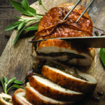 325 F and roast until internal temperature on instant-read thermometer reads 165 F, about 40 minutes longer. Remove and transfer to platter, reserving pan juices. Cover stuffed turkey breast with sheet of foil to rest while preparing sauce.
