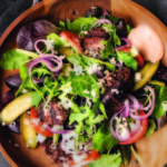 Stir together mayonnaise, vinegar, tomato paste, garlic, and paprika. Drizzle dressing evenly over salads.