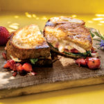 In skillet over medium-low heat, melt butter. Top a slice of bread with 1/4 of each sandwich topping: chicken, cheese, strawberry sauce, and arugula. Cover with a second slice of bread. Repeat with remaining ingredients. Cook sandwiches in skillet until bread is crispy and golden and cheese has melted, about 3 minutes per side. Prepare sandwiches in batches if necessary.