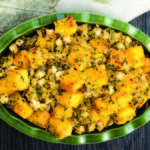 In large saucepan, warm remaining 1 Tbsp oil over medium heat. Add leeks and bay leaf and sauté until leeks are starting to brown, about 6 minutes. Stir in celery, fennel, garlic, and chipotle chili and continue to cook, stirring frequently, until celery and fennel have softened, about 10 minutes. Stir in parsley, sage, thyme, and apple before tipping mixture into large bowl. Add cornbread cubes and toss to combine. Discard bay leaf.