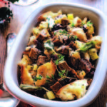 Turn mixture over bread and toss to evenly mix. Spoon into a 13 x 9 x 2 inch baking pan or casserole dish. Drizzle with broth. Cover pan with foil; bake for 15 minutes, then uncover and continue baking until warm and crusty, about 15 more minutes.