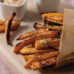 When fries are done, transfer to small platter. Sprinkle with chopped herbs and serve with sauces for dipping on the side. Rutabaga fries are delicious served as a side dish with any main course.