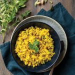 Return sauté pan to heat and add oil. Once oil is warmed, add mustard and cumin seeds and bring to a sizzle while stirring constantly. Once seeds start to pop, add curry leaves and fry for 30 seconds. Add onion and sauté until translucent and just starting to brown around edges, about 4 minutes. Stir in turmeric and let cook another minute before adding cooked quinoa and lemon zest. Cook, stirring constantly, to warm mixture, about 1 minute. Stir in lemon juice, cilantro, and peas. Remove mixture from heat and stir in toasted pistachios before transferring to a serving bowl.