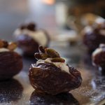 To assemble, spoon about 1 tsp of ricotta mixture into each date and top with a few pumpkin seeds.