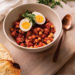 In large skillet, heat oil over medium. Add garlic and anchovy; cook, stirring, until fragrant, about 30 seconds. Stir in tomato paste; heat for 30 seconds. Add wine to pan, and simmer for 1 minute, scraping up any brown bits. Add tomatoes and their juices, Italian seasoning, red pepper flakes, and black pepper. Cook until liquid is reduced by half, about 10 minutes. Stir in chickpeas, olives, and capers; heat for 1 minute. Nestle in eggs. Garnish with basil or parsley.