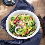 In large bowl, place kale and drizzle with 1 Tbsp oil; using fingertips, rub oil into leaves to soften. Add Romaine, radicchio, endive, cucumber, carrot, tomatoes, radishes, apple slices, and sweet onion, separated into rings.