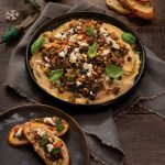 To serve, spoon caponata onto crostini and top with a little crumbled cheese and toasted nuts. Alternatively, on shallow platter, smear with silky smooth plain hummus and tumble caponata overtop. Garnish with a little crumbled cheese and toasted nuts.