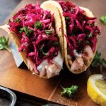 Place chunks of trout on tortillas and top with slaw and dollops of horseradish cream.