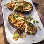 Arrange roasted eggplant on serving platter, flesh side up. With the back of a spoon, push the flesh down to create a cavity. Spoon in freekeh filling. Drizzle on tahini dressing and scatter on parsley.