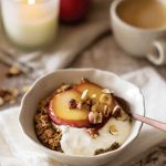 When ready to serve, make caramelized pears. In large frying pan, add pear slices and remaining 2 Tbsp maple syrup and bring to a hard simmer over medium-high heat. Let pears cook and caramelize while flipping pears occasionally, about 4 minutes total. Remove frying pan from heat and set aside.