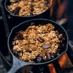 To make crumble, place cherries in appropriately sized cast iron skillet. Sprinkle with chocolate chips and granola. Cover and bake in preheated 350 F oven for 20 minutes, or over the hot coals of a campfire, until juices are bubbling. Remove cover and bake for a further 5 minutes.