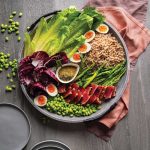 When ready to serve, on large platter or board, arrange romaine and radicchio leaves, edamame, spelt, and asparagus in separate sections. Using sharp knife, carefully slice tuna and fan out pieces to make them easy to select. Slice eggs in half and arrange on board.