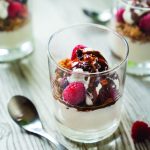To serve, divide yogurt among 4 serving bowls and drizzle on espresso sauce. Top with granola, raspberries, and cacao nibs, if using.