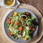 To assemble salad, in large bowl, toss remaining dressing with sliced fennel and garbanzos and coat thoroughly. Add mixed greens, dressed tomatoes, and grapes, and continue to toss until evenly combined. Just before serving, sprinkle 4 Tbsp of toasted buckwheat overtop the salad.
