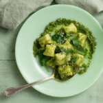 In a large pot, bring a large amount of lightly salted water to boiling; then reduce heat to a slow simmer. Add half of the gnocchi, stirring so they don’t stick together. Cook about 2 minutes or until they rise to the top. Remove with a slotted spoon to a colander, and repeat with remaining gnocchi. Place gnocchi in a bowl and toss with as much of the pesto as is needed to coat thoroughly (about 4–5 generous tablespoons).