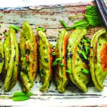 To fold gyoza wrapper, place 1 heaping tsp filling in center of a dough circle (gyoza wrapper). If you’ve rolled the dough out too thick, you can use your hands to stretch out dough slightly. Brush edge of wrapper with water and, if using dumpling press, press dough together until sealed. If pressing by hand, fold into a fan pattern, or as desired, making sure the seams are sealed. Place in single layer on parchment-lined baking sheet. Repeat this process with all wrappers. Gyozas are ready to be cooked or can be frozen at this stage.