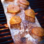 Preheat barbecue to 350 F. On soaked cedar plank, place cod pieces, evenly spaced apart. Thinly slice remaining orange into rounds and arrange on top of cod. Place plank on grill and close lid. Barbecue cod for 20 to 25 minutes, depending on thickness of flesh. Keep a spray bottle with water handy to put out any flare-ups from the wood plank. You want the wood to smoke—not catch fire. Avoid spraying water directly on fish. Fish is done when it flakes easily with a fork and its center is almost no longer translucent. Remove plank and cod from grill using long spatula and place on baking sheet. Cod is delicious served with grilled veggies.