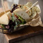 Slice (and toast, if desired) sourdough ciabatta buns. Spread Greek yogurt on each side, followed by mayo. Build each sandwich with some mixed lettuce, sliced chicken, and tomato slices. Lastly, drizzle white wine vinegar overtop and slice sandwich in half. Serve with ranch chips on the side.