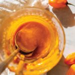 While habaneros are roasting, in medium saucepan, sauté onion and carrot on stovetop in 2 Tbsp olive oil until soft, about 7 minutes. Add salt, vinegar, water, and orange juice to carrot-onion mixture and tip in roasted peppers and garlic. Simmer for 10 minutes. Remove from heat and allow to cool for approximately 20 minutes.