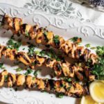 Soak wooden skewers for at least 30 minutes before threading chicken. Thread 4 to 5 chicken cubes onto each skewer. Reserve marinade.