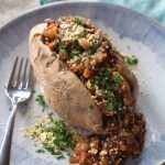 Slice open potatoes along their length and top with Lentil Bolognese. Sprinkle on Hemp Parm mixture and garnish with parsley.