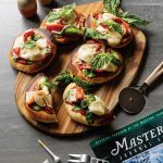 Spread pitas with tomato sauce and then top with spinach, chicken slices, roasted red pepper, tomatoes, and mozzarella. Broil on high until cheese has melted, about 2 minutes. Top with basil and some freshly cracked black pepper.