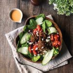 Divide spinach among 4 serving bowls and top with farro, cucumber, tomatoes, and meatballs. Scatter on feta, olives, and parsley. Drizzle on hummus dressing.