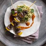 Middle Eastern Kebabs with Pearl Couscous and Roasted Red Pepper Sauce