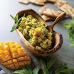 Halve avocados, discard pit, scoop out flesh, and add to bowl along with marinated shallots. Mash with fork until you get a creamy dip, the consistency that you like. Fold in cilantro, mint, serrano chili, and 3/4 of the mango. Let sit for 10 minutes at room temperature before garnishing with extra torn mint leaves, remaining diced mango, and a sprinkling of green onion. Serve alongside jicama sticks or pita chips, if desired.